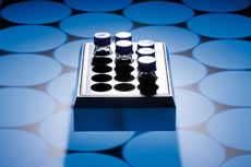 Bloco que combina agitação e aquecimento com 15 posições de agitação, 15 furos, Ø 57,5 mm, profundidade de 48 mm, distância de 65 mm, adequado para frascos de laboratório de 100 ml (ex. Schott) e para béqueres de vidro de 150 ml (formato alto).