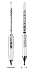 Estes hidrômetros planos estão disponíveis em uma variedade de modelos que medem gravidade específica/densidade relativa (g/cm3) de líquidos mais leves e mais pesados que a água em diversas faixas de 0.690 a 3.000.