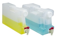 Recipiente de polipropileno no estilo Book Bottle possui uma torneira rosqueada e vedada na garrafa. É necessário apenas 1/4” de volta da posição fechada para abrir a torneira completamente e possui uma abertura de 9,5mm de diâmetro interno que se estende da frente da garrafa por 58mm.