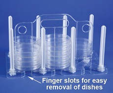 Estante de TPX® transparente com colunas de polipropileno acomoda de forma segura até 54 placas de Petri. Transportada desmontada, ela pode ser montada em minutos.