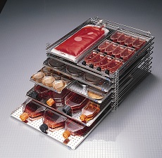 Estante modular e sistema de bandejas que maximizam o armazenamento de placas de Petri e frascos de cultura de células em incubadoras, câmaras frias ou sobre a bancada.