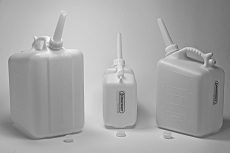 Recipientes de polietileno de alta densidade com um bico longo de 20cm com ventilação embutida. O recipiente de 20 litros possui um bico de 2,5cm de diâmetro interno; outros tamanhos possuem bicos de 1,9cm.
