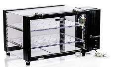 Dessecador duradouro com painel PVC transparentes e detalhes em ABS preto, perfil horizontal e prateleiras móveis para tornar a configuração de armazenamento ajustável.