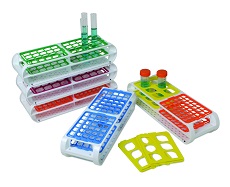 Esta rack inovadora com estrutura dividida acomoda dois tamanhos de tubos diferentes na mesma estante e permite que os usuários troquem as grades rapidamente para acomodar outros tamanhos conforme necessário. Cada rack inclui um conjunto de grades de um tamanho. Conjuntos de grades em tamanhos alternados podem ser pedidos separadamente.