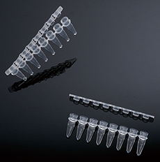 Tiras de 8 microtubos de PCR estéreis de polipropileno, volume de 0,2 mL cada. 5 opções de cores (incolor, rosa, verde, azul ou amarelo) e 2 opções de tampa (plana ou abaulada).