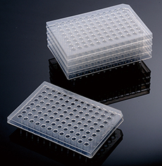 Placas de 96 poços para PCR, feitas de polipropileno, modelo meia-borda. 5 opções de cores disponíveis (incolor, rosa, verde, azul ou amarelo).