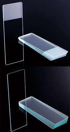 Lâminas para microscopia de vidro com borda lisa ou fosca. Bordas lisas aumentam a área útil, enquanto bordas foscas são úteis para identificar as lâminas escrevendo nessa borda. As lâminas são bem polidas e possuem cantos arredondados para evitar cortes, protegendo o usuário.