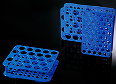 Racks de tubos de centrifugação fabricados em polipropileno de grau médico resistente e azul. Dois modelos disponíveis, um para 50 tubos de 15 mL e outro para 25 tubos de 50 mL.
