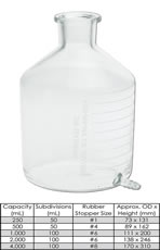 Com graduações brancas permanentes. Útil como reservatório para trabalho de fermentação ou como um alimentador animal em larga escala. A garrafa possui a parte superior trabalhada e reforçada para aceitar os tamanhos listados de rolha de borracha. A conexão da mangueira possui um OD de 9mm na parte mais larga do recorte.