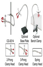 Braçadeira flexível para uso em dispositivos de laboratório que são normalmente difíceis de segurar devido ao seu tamanho, formato ou ângulos diferentes. O braço flexível único pode ser colocado virtualmente em qualquer posição ou ângulo. Disponível na escolha de 12 ou 18” de comprimento do braço flexível. O item completo consiste de cabeça de braçadeira com duas garras, cabeça de braçadeira com 3 garras, mola da cabeça de braçadeira, braço flexível e conector de estrutura de laboratório com chave de utilidades. A placa de base e as braçadeiras de bancada estão disponíveis como itens opcionais. |