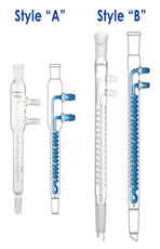 Condensador de refluxo estilo espiral com a espiral envolta de modo firme para fornecer resfriamento máximo. Excelente para uso com solventes em vapor de alta pressão. O condensador possui uma junção externa superior em ângulo de 75° com o corpo do condensador, e junção inferior interna para gotejamento. Conexões de mangueira com OD de 10mm no meio do recorte.