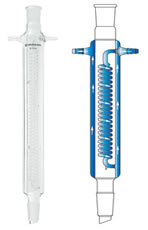 Condensador de refluxo com espiral interna com jaqueta d’água. Os vapores são condensados tanto na espiral quanto na parede interna da jaqueta. A extremidade superior possui uma junção cônica padronizada externa e a junção inferior interna para gotejamento. Conexões de mangueira com OD de 10mm no meio do recorte.