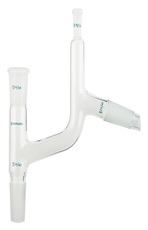Adaptador de destilador contendo um membro externo na vertical do tubo lateral com um termômetro do tamanho da junção listada e imersão. Braço lateral possui uma junção com extremidade interna cônica para gotejamento enquanto o tubo vertical possui uma junção interna inferior e externa superior, todas sendo do mesmo tamanho.