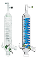 Condensador com dupla espiral para uso com evaporadores giratórios para resfriamento com água de torneira em uma posição diagonal. O condensador com borda de OD 50mm no fundo, válvula superior 19/38, e conexões de mangueira removíveis utilizando roscas de vidro GL-14. O condensador é fornecido completo com tampas de plástico e recortes das conexões de mangueira.