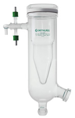 Condensador estilo coletor de duas peças para uso com evaporadores giratórios. Condensador com borda de 50mm na lateral, junção esférica inferior 35/20, plugue de torneira 19/38 e conexões de mangueira removíveis utilizando roscas de vidro GL-14. O condensador é fornecido completo com anel central de Teflon junto com tampas de plástico e recortes para conexões de mangueiras. A superfície de plástico está apenas no exterior da manga do condensador.