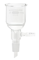 Funil com filtro estilo Buchner tendo junção interna cônica padronizada inferior e recorte para tubulação para conexão de bomba de vácuo. Os diâmetros do disco e a altura acima do disco são as mesmas do CG-1402.
