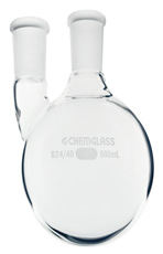 Frasco de parede grossa e fundo redondo com dois pescoços e junção externa cônica padronizada tanto no pescoço central como no pescoço lateral vertical. Os frascos com tamanhos de junção diferentes dos listados estão disponíveis sob consulta.