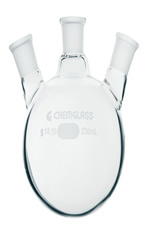 Frasco de parede grossa e fundo redondo com três pescoços com junção externa cônica padronizada no pescoço central e nos pescoços laterais em ângulo de 20°.