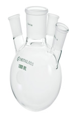 Frasco de parede grossa e fundo redondo com quatro pescoços com junção externa cônica padronizada no pescoço central e nos pescoços laterais em ângulo de 20°. Frascos com tamanhos de junção diferentes dos listados estão disponíveis sob consulta.