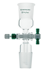Adaptador com uma torneira de medição em Teflon de 2mm entre as junções cônicas padrão superior externa e inferior interna para permitir o controle do fluxo de fluidos entre os dispositivos.