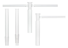 Os tamanhos 19/38 são para substituição de portas de entrada de vácuo Buchi. A peça de código CG-132-02 possui um único braço lateral e uma extremidade para gotejamento que permite que a vedação seja feita para tubo de alimentação de Teflon. A peça de código CG-132-03 possui dois braços laterais separados em 180° e é utilizado para substituição do coletor vertical do condensador. |