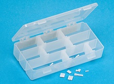 Caixa de plástico transparente contém um sortimento dos nossos tamanhos mais populares das micro barras magnéticas CG-2003. A caixa possui divisórias de plástico móveis fornecendo espaço para barras de agitação adicionais.