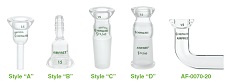 Adaptadores para uso com os coletores de vácuo do AF-0060 até o AF-0062, o que permite que o coletor seja utilizado com várias vidrarias padronizadas ou tubos. Os adaptadores AF-0070 devem ser utilizados com encaixe Cajon® nas portas principais ou nas extremidades do coletor com tubo de vácuo de borracha de parede pesada. A lista dos adaptadores de conexão de mangueira apresenta o OD da conexão da mangueira no anel intermediário. Cada adaptador é fornecido completo com um o-ring Viton #116. Os adaptadores devem ser fixos ao coletor através de uma braçadeira de aperto S.S. CG-150-05. |