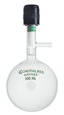 Frasco de armazenamento com braço lateral com OD de 9mm para uso com conexões Cajon® 3/8”. Válvula Chem-Vac™ Chem-Cap® usada para controlar o fluxo de gás ou líquido para dentro do frasco.