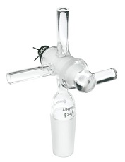 O adaptador permite que os frascos sejam preenchidos com gás inerte durante a amostragem diretamente através do furo da torneira com furo em “T”. Disponível com escolha de torneira de vidro alto vácuo 4mm tendo um dispositivo S.S. de retenção de pressão constante ou uma torneira de Teflon 4mm. Ambas torneiras, de vidro ou Teflon possuem braços com parede média e OD 9mm para uso com rolha com septo vermelho CG-3022-05 ou branco CG-3022-22. Observação: não é fornecido com a rolha com septo.