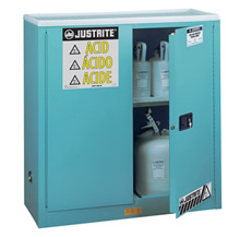 Tamanhos padrões de 114, 170 e 227 litros nas linhas estreita, compacta, de bancadas e sob bancadas, e empilhável. Possuem as mesmas características de qualidade dos gabinetes de segurança Justrite, com paredes duplas, duas aberturas de ventilação, conectores para aterramento, prateleiras ajustáveis, reservatórios de contenção, portas de auto travamento de 3 pontos, e pés niveladores para superfícies irregulares. Também incluem bandejas em Polietileno anexas às prateleiras em aço galvanizado e um revestimento em Polietileno para o reservatório de contenção inferior. O gabinete de 114 litros de duas portas, também possui uma superfície em Polietileno. Todos possuem acabamento com tinta Epoxy. |