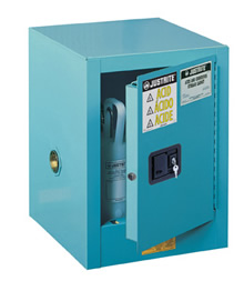 Gabinetes para ácidos em tamanhos especiais: Possuem as mesmas características de segurança que todos os gabinetes da Justrite têm para produtos inflamáveis, além de prateleiras em aço galvanizado com bandejas em Polietileno e um forro de reservatório de contenção. Com acabamento especial para ambientes laboratoriais, são pintados em tinta Epoxy.
