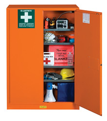 Gabinetes de emergência: Com design para proteção contra incêndios, foram fabricados com acabamento de tinta Epoxy na cor “laranja emergência” para excelente visibilidade. Etiquetas Glo Alert™ que brilham no escuro e em baixo de fumaça para fácil localização. Possuem quatro prateleiras ajustáveis, espaços reservados para material de primeiros socorros e outros, portas com auto travamento e dobradiças de fechamento suave, e garantia de 10 anos. Como características adicionais, possuem fechadura U-Loc™ com 2 chaves e pés ajustáveis para pisos irregulares. |