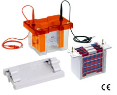 Os sistemas de eletroblotting foram projetados primariamente para eletroforese úmida de proteínas, e oferecem uma combinação de maior capacidade com aspectos econômicos. Os sistemas de eletroblotting tem maior capacidade do que os sistemas padrão. Até cinco cassetes de gel/blot podem ser utilizados de uma vez só para o Eletroblot Mini e Maxi, e até três cassetes de gel podem ser utilizados para o Eletroblot Mini Wide. Isso é muito útil em laboratórios de alto rendimento. Um campo elétrico uniforme é fornecido por um eletrodo de alta intensidade e garante transferência uniforme pela superfície do blot. A arquitetura aberta do cassete garante uma área de blot máxima e permite transferência direta de corrente. Sua construção rígida assegura contato entre o gel e a membrana, e a membrana retém completamente o blot onde uma pressão é mantida por igual. Essas unidades são compatíveis com agitadores magnéticos para ajudar a dispersar o calor e evitar quedas bruscas no pH do tampão devido a uma mistura incompleta do tampão. Cada unidade inclui um pacote de resfriamento para aumentar a eficiência da transferência por remover o excesso de calor. Isso também economiza a quantidade de tampão e aumenta a economia. |