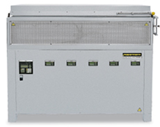 A câmera do forno de gradiente GR 1300/13 está subdividida em seis zonas reguladas, com o mesmo comprimento. A temperatura em cada uma das seis zonas de aquecimento é regulável individualmente. O carregamento do forno é feito, normalmente, pelo lado, através da porta oscilante paralela aí colocada. Ao longo do comprimento aquecido de 1300 mm, pode ser regulado um gradiente máximo de temperatura de 400 °C, no máximo. Se desejar, o forno pode também ser concebido como forno de estirar, com uma segunda porta no lado oposto. Como equipamento adicional, estão disponíveis separações da câmera em fibra, que dividem a câmera do forno em seis câmeras do mesmo tamanho. O carregamento é feito por cima, abrindo a tampa de grandes dimensões. |