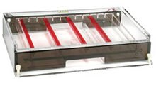 Gel Size: (W x L) 23 x 40 cm O Owl A3-1 Wide Gel System pode correr de 25 a 600 amostras em um único gel. O gel pode ser moldado com diferentes comprimentos no intuito de economizar agarose quando uma quantidade menor de amostras for utilizada. Esta unidade possui entradas integradas para a realização de trocas de tampão, permitindo a recirculação do tampão em corridas muito longas, caso necessário. O maior número de encaixes para pentes lhe oferece maior flexibilidade para a inserção e organização das amostras. O Owl A3-1 Wide Gel System incorpora o design Owl à prova de vazamentos. A bandeja de géis UVT é equipada com uma junta de vedação que permite com que o gel se encaixe perfeitamente na bandeja, proporcionando vedação à prova de vazamentos. O nivelador integrado garante a moldagem de géis uniformes, espessos e planos. O carregamento de amostras torna-se ainda melhor caso for utilizado micropipetas especialmente designadas a este sistema. Ao utilizar uma pipeta multicanal, as amostras podem ser carregadas diretamente a partir de uma placa de 96 poços, 8 ou 12 amostras por vez. Este método acelera a transferência de amostras e reduz a possibilidade de erros. A utilização do eletrodo garante rápida execução sem comprometer a resolução das amostras. |