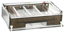 Gel Size: (W x L) 20 x 25 cm O Owl A2 Large Gel System é um sistema simples, prático e rápido para análises detalhadas de DNA / RNA e múltiplas amostras. Este sistema oferece a mais ampla variedade de opções de pentes para a preparação de géis de diferentes tamanhos. O Owl A2 Wide Gel System incorpora o design Owl à prova de vazamentos. A bandeja de géis UVT é equipada com uma junta de vedação que permite com que o gel se encaixe perfeitamente na bandeja, proporcionando vedação à prova de vazamentos. O nivelador integrado garante a modelagem de géis uniformes, espessos e planos. O carregamento de amostras torna-se ainda melhor caso for utilizado micropipetas especialmente designadas a este sistema. Ao utilizar uma pipeta multicanal, as amostras podem ser carregadas diretamente a partir de uma placa de 96 poços, 8 ou 12 amostras por vez. Este método acelera a transferência de amostras e reduz a possibilidade de erros. Diversos encaixes para pentes sobre a bandeja de gel UVT são posicionados para a disposição de dois, três ou quatro conjuntos de amostras em único gel. |