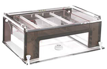 Gel Size: (W x L) 20 x 25 cm O Owl A5 Large Gel System com sistema de recirculação integrada oferece conveniência e versatilidade. O sistema de recirculação, evita a formação de gradiente iônico e gradiente de pH oferecendo resultados uniformes, reprodutíveis e de alta resolução. O sistema é ideal para longas execuções, conjuntos múltiplos de amostras ou géis de RNA. O mesmo sistema elimina migrações irregulares, distorções de bandas ou dissociação de moléculas de RNA glicosiladas dependentes de pH, que podem ocorrer por esgotamento iônico. Devido ao sistema de recirculação ser integrado dentro da cuba, não há necessidade do uso de bombas externas, tubos ou barras de agitação. |