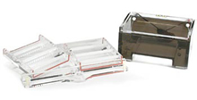 Gel Size: (W x L) 16 x 17 cm O Owl D4 System é projetado para fornecer padrões uniformes e resultados consistentes, livre de problemas. Fitas, graxa, selos de agarose ou outros acessórios não são necessários. O design do sistema permite com que você realize a corrida em uma bandeja de gel (51 amostras) ou empilhe duas bandejas de géis (102 amostras) dentro da cuba, economizando espaço em sua bancada. Cada uma das duas bandejas de géis (UVT), 16 x 17 cm, acomoda até três pentes, permitindo que o usuário execute até três séries de amostras de distâncias iguais. Uma bandeja independente é inclusa para a preparação simultânea de dois géis. Pentes personalizados poderão ser disponibilizados mediante solicitação. |