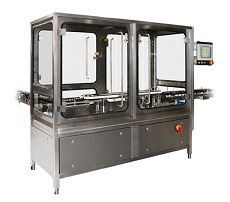 A série EVW é o único sistema de descontaminação em linha da indústria para encapsular completamente as tampas dos vials com um selo à prova d’água. Isto permite pressão de lavagem maior para limpeza; todo o corpo do vial incluindo o fundo é exposto aos jatos de água. O ar comprimido é utilizado para secar os vials antes de descarregar jatos secos. A série EVW é controlada por um PLC/IHM Allen Bradley ou Siemens (à escolha do consumidor). A configuração é direcionada com ajuste automático da altura para acomodar containers de 2ml a 500ml. Rendimento de até 300 vials por minuto. Tampas de 13mm ou 20mm podem ser processadas no equipamento sem a necessidade de substituir peças. A substituição leva 5 minutos e não necessita de ferramentas; apenas troque os parafusos de sincronização de alimentação e saída. Os tubos para lavagem e secagem assim como o sistema de controle elétrico é abrigado na base do equipamento. |
